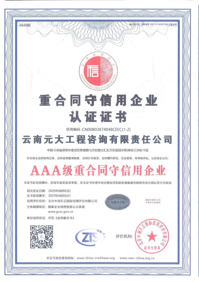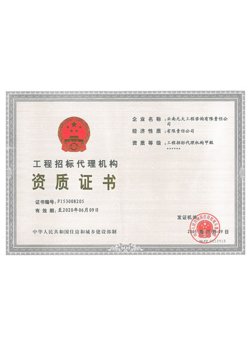 公司是云南省招標投標行業協會會長單位,現為云南省住建廳信用評級招標代理機構AAA級單位。公司先后榮獲住建部頒發的“工程招標代理機構甲級資質證書”、財政部頒發的“政府采購代理機構甲級資格證書”,并在財政部及中國政府采購網“政府采購代理機構名單”登記備案、獲得國家發展改革委頒發的“中央投資項目招標代理機構甲級資格證書”、商務部頒發的“國際招標機構預乙級資格證書”、機電產品國際招標電子交易平臺頒發的“機電產品國際招標電子交易證書”、國家國防科技工業局頒發的“軍工涉密業務咨詢服務安全保密條件備案證書”。公司已通過ISO9001:2015質量管理體系認證、ISO14001:2015環境管理體系認證、ISO45001:2018職業健康安全管理體系認證。納稅信用評價已連續三年被評為A級......